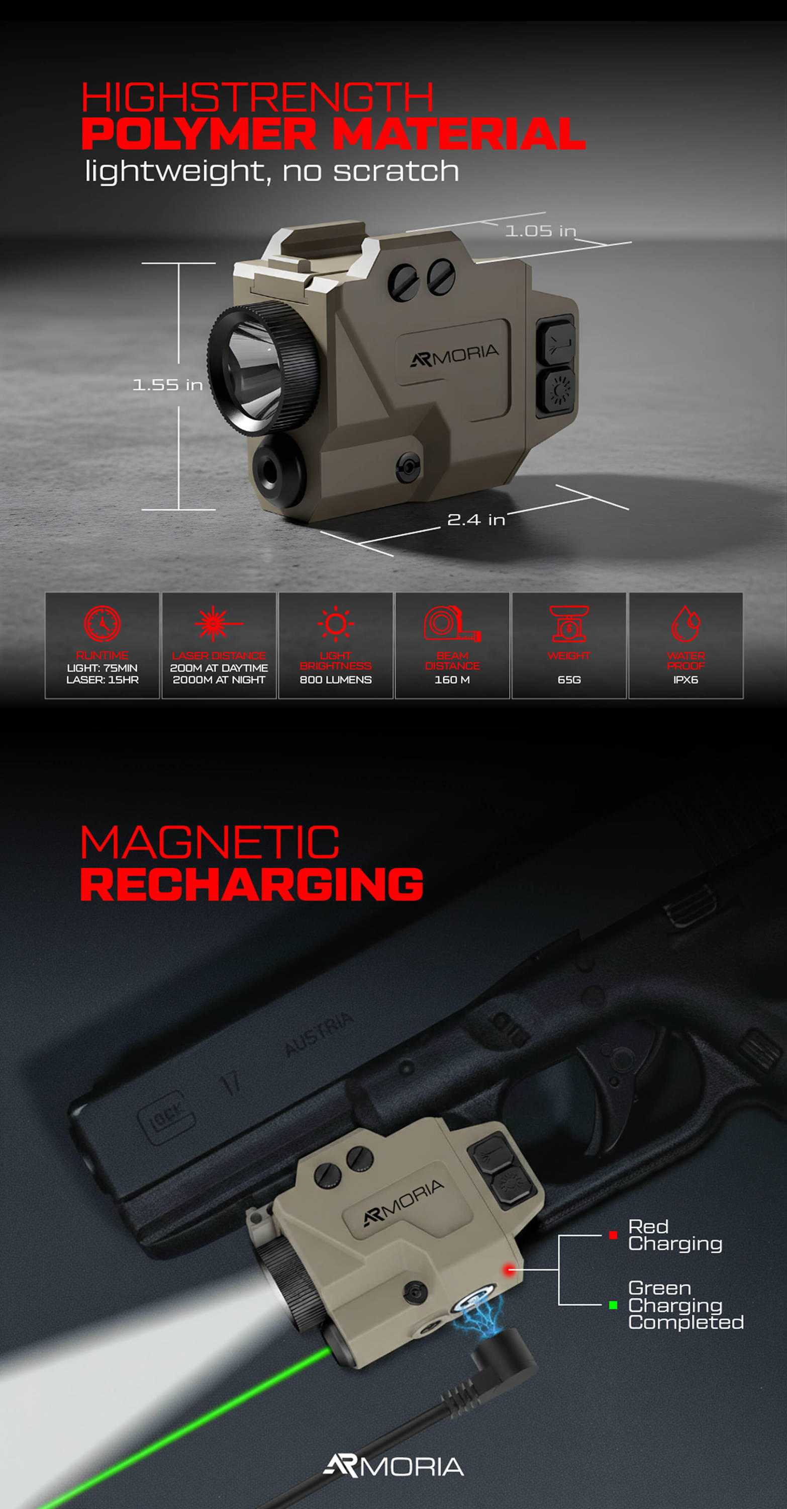 Forget exposed USB ports that collect dust and moisture. The Dual Compact's sealed magnetic charging cable snaps into place and keeps your light sealed tight even while mounted. And with the patented slidable Picatinny rail, you'll never buy a different light for each pistol again. One light. Every gun. Zero hassle.